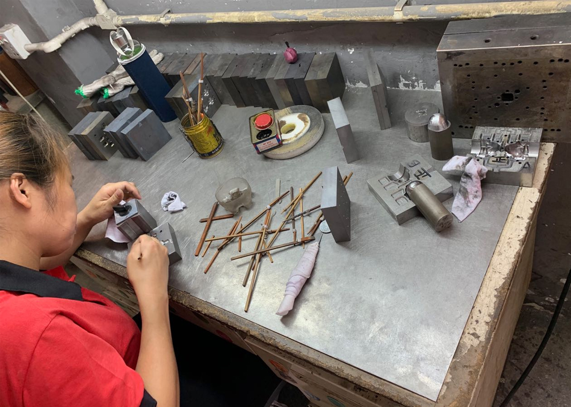 压制料件:把模具装上压台,将设计图案转压到金属件原料上(铜、铁、铝等)。